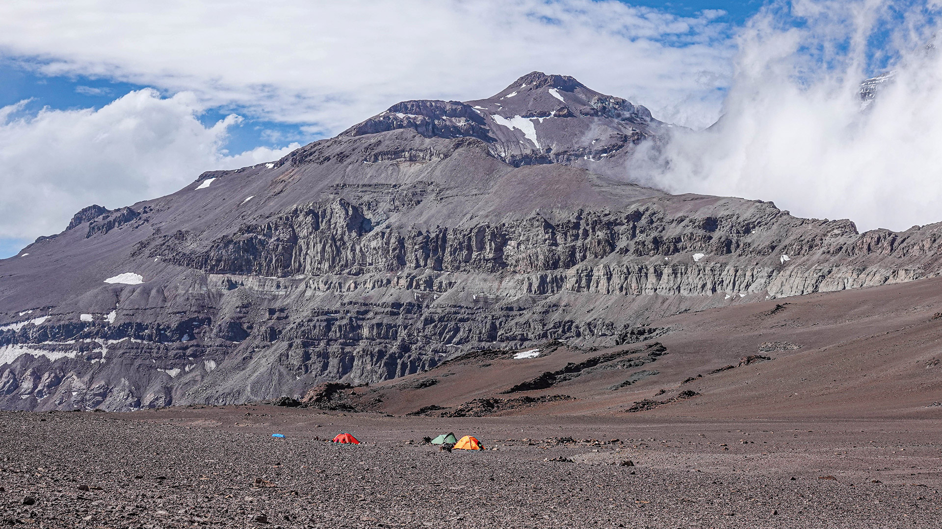 Salimos temprano desde Santiago con dirección a La Parva. Desde allí comienza la caminata con paso tranquilo, cruzando la Laguna Piuquenes y avanzando por la ruta al Cerro Pintor. Luego de varias horas y con hermosas vistas a la Sierra de Ramón y el Plomo, llegamos a nuestro campamento alto a los pies del Leonera, donde montamos carpas, cenamos y descansamos bajo las estrellas.
